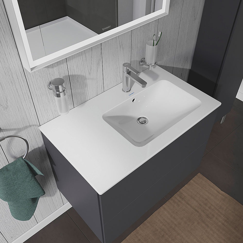 This Duravit washbasin with sink comes from the ME by Starck design series by Philippe Starck. The high-quality sanitary ceramic not only impresses with its elegant design, but also its durability and scratch resistance. In addition, the ceramic material has a high level of hardness. The easy-clean and hygienic surface not only has a shiny look, it is also easy to care for. The washbasin is also available with an optional water-repellent WonderGliss finish - for particularly easy cleaning and even greater comfort. The asymmetrically placed basin gives this attractive washbasin plenty of space. This vanity is also available in a satin finish. This wall-mounted washbasin is perfect and visually-appealing when installed with other bathroom furniture. It has an overflow and faucet deck.