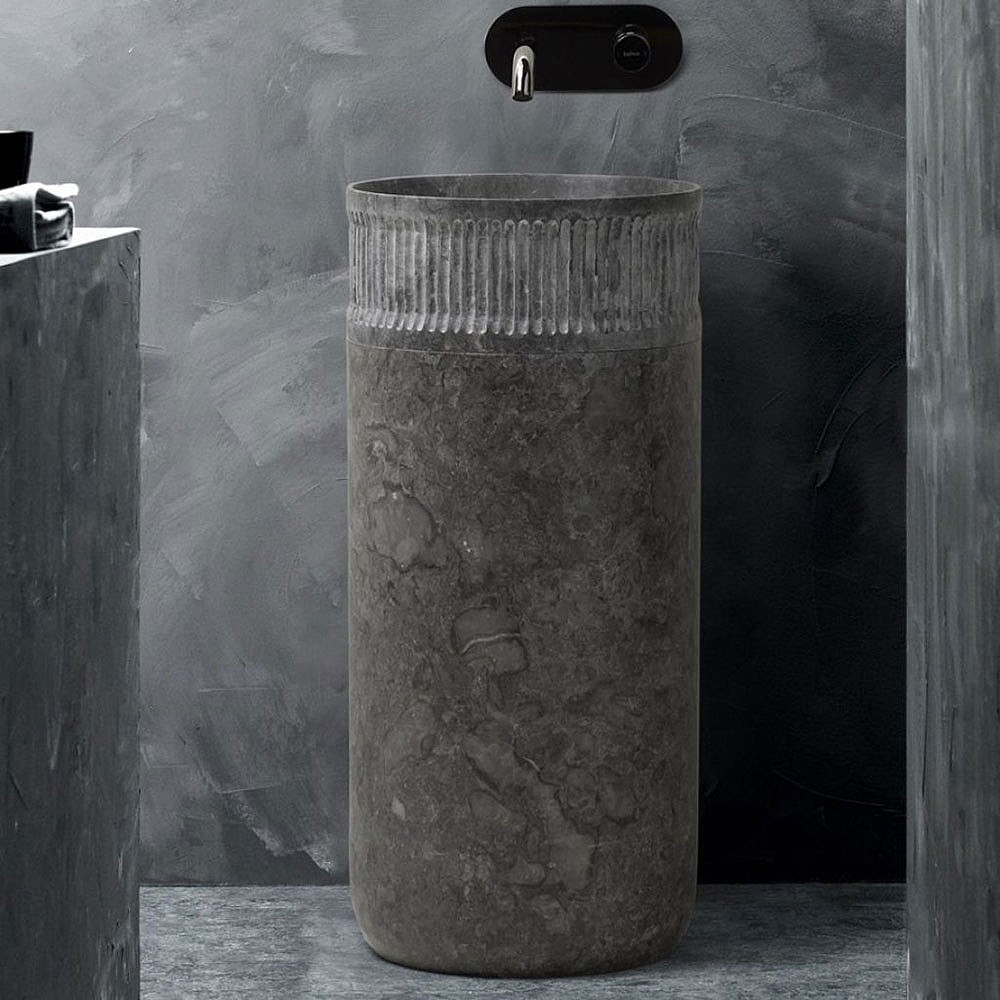 Our Teleno Freestanding Pedestal washbasin creates a statement in modern bathrooms whilst adding a touch of Balearic-inspired design. Expertly crafted from natural stone, this bathroom basin combines artisanal charm with everyday practicality. The basin sits on a smooth, sculptured plinth and features rounded groove detailing on the exterior.