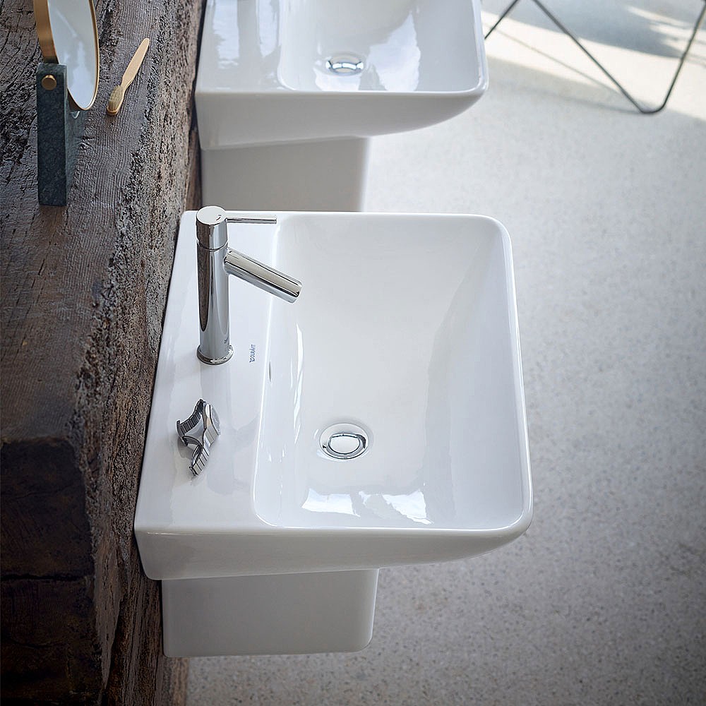 The Duravit washbasin with large inner basin, overflow and faucet deck comes from the attractive ME by Starck design series by Philippe Starck. Made from high-quality sanitary ceramic, it impresses with its durability, scratch resistance and high level of hardness. The washbasin gets its elegant look from the rectangular shape with narrow, all-round rim and subtly rounded corners. The washbasin is available in white high gloss and satin matt. The easy-to-clean ceramic surface and fully glazed underside ensure optimum hygiene. The washbasin is also available with an optional water-repellent WonderGliss finish - for particularly easy cleaning and even greater comfort. Duravit fittings in various designs and a suitable pedestal or semi-pedestal are among the recommended accessories.