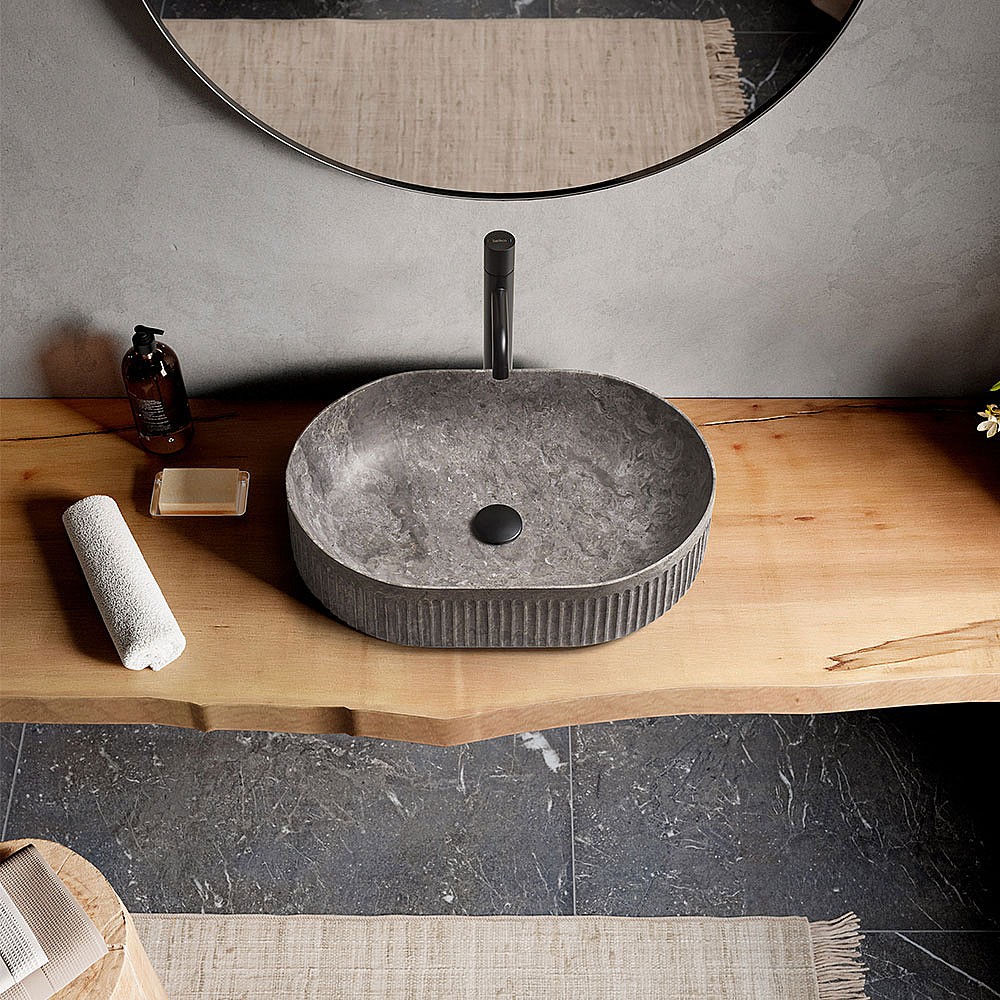 Our Teleno Oval Washbasin is a neat, compact option ideal for modern bathrooms seeking a touch of Balearic-inspired design. Expertly crafted from natural stone, this bathroom basin combines artisanal charm with everyday practicality. It features rounded groove detailing on the exterior for added texture and a smooth interior surface for easy cleaning and optimal performance.