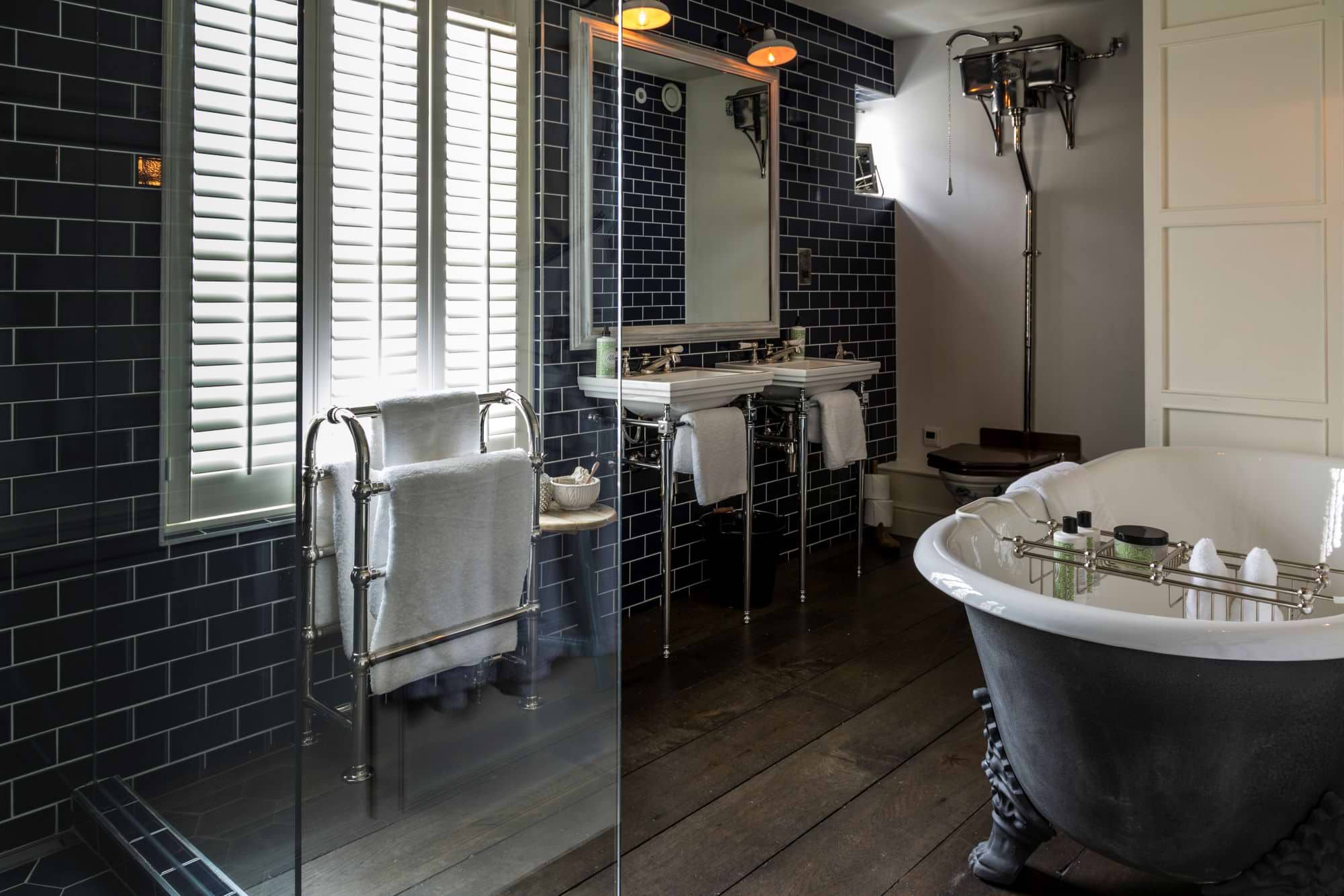 Featured: C.P. Hart's exclusive Lincoln Freestanding Bath painted in a deep inky blue, as seen at our recent project, 131 The Promenade.