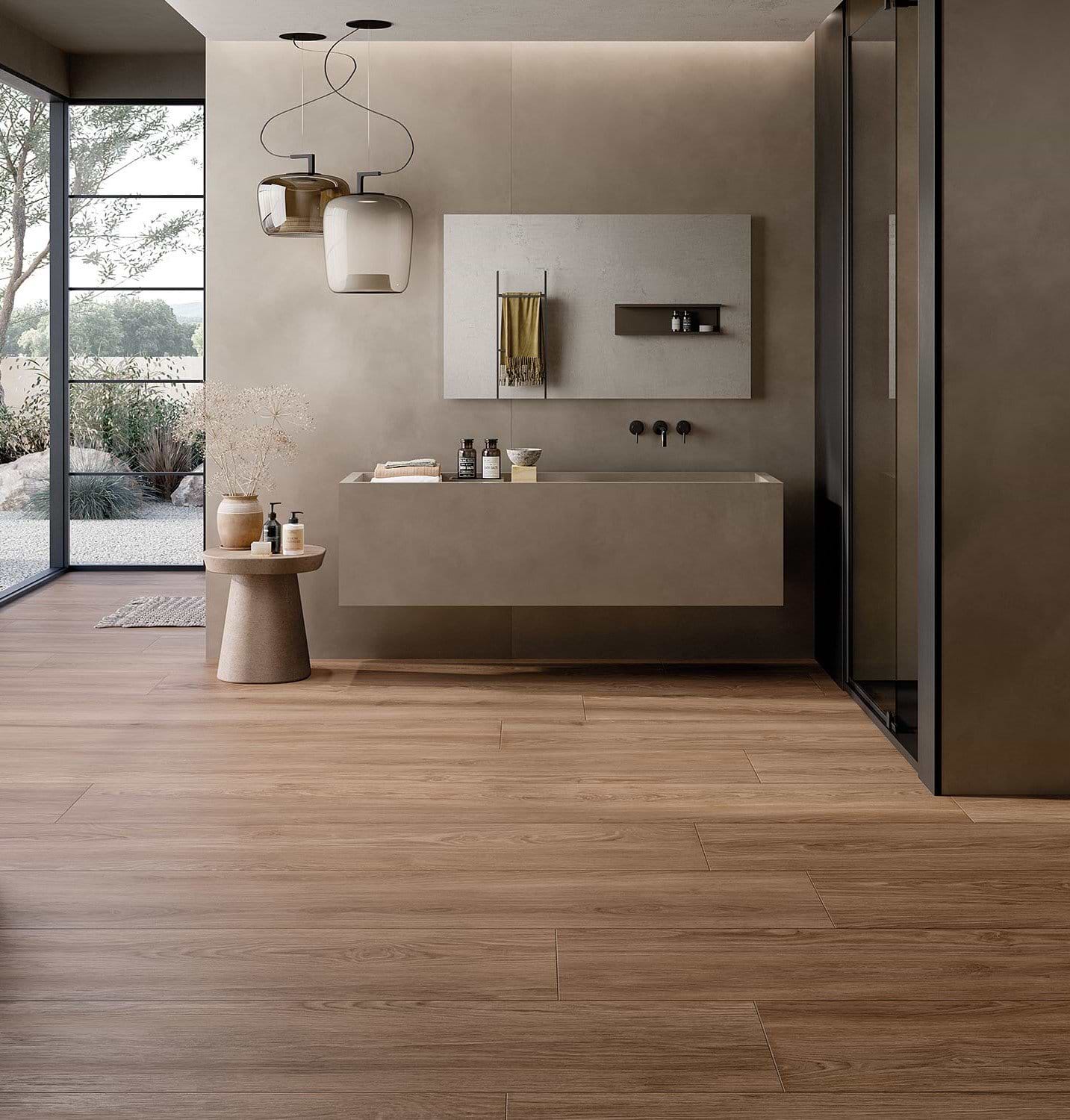 Featured: our Essenza Oudh tiles in the Laos finish, emulating the tones and texture of natural wood that warm the space.