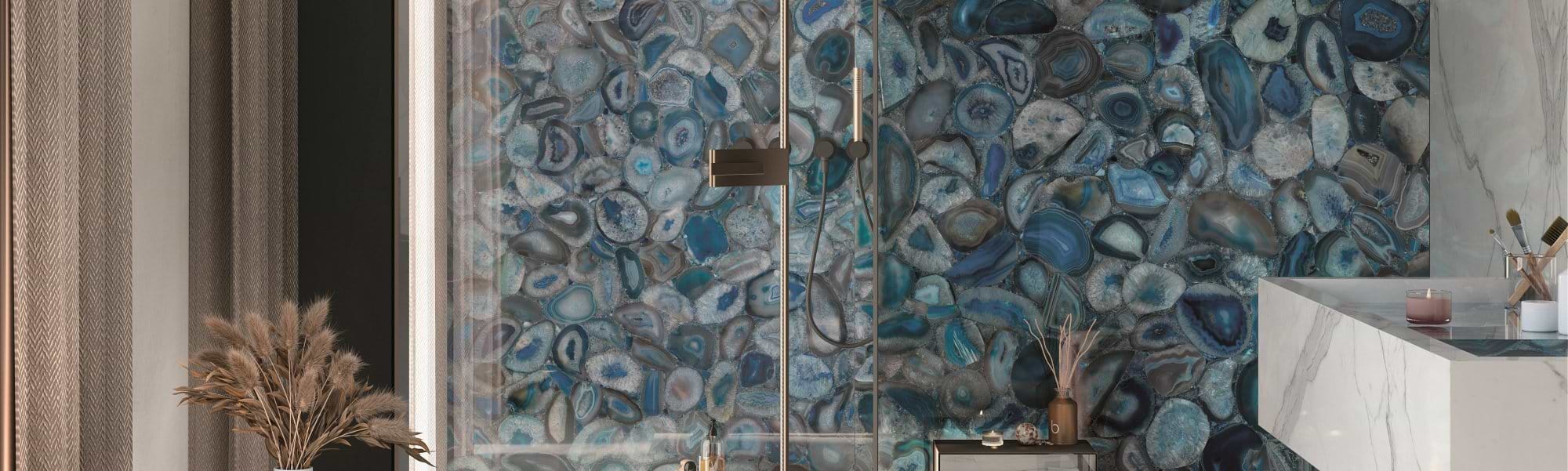 If you know you love colour and wish to create a vibrant bathroom to reflect this, then, by all means, go for a bold tile. Colourful tiles can be installed all over or in select areas of the room, such as above the basin or in the shower enclosure. Our Wanderlust tiles are an excellent choice for this, presenting a striking palette of jewelled colours and textures in seven marble finishes and three agate conglomerates.