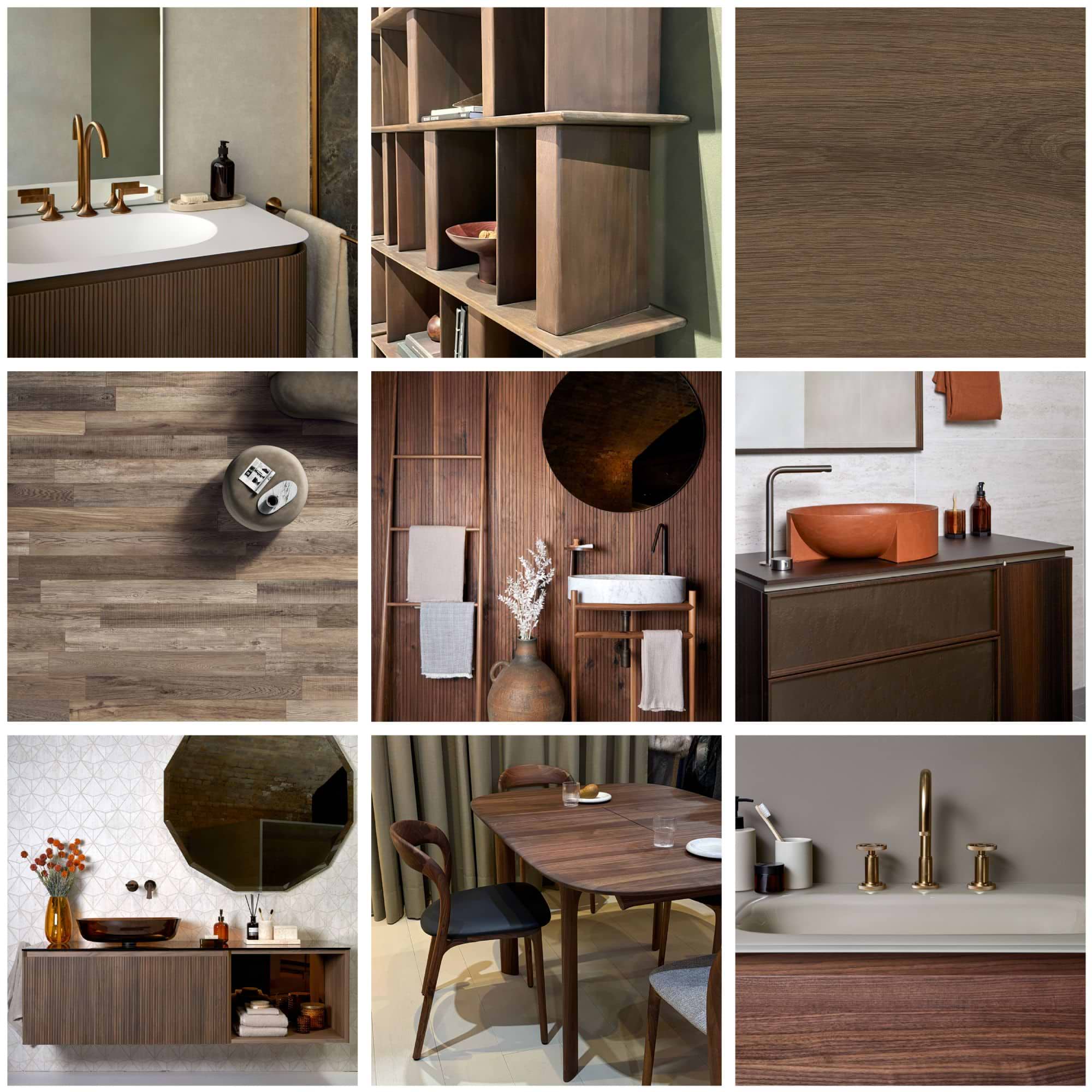 Rich, warm, and luxurious woods (walnut, mahogany, and mango) work beautifully when balanced with lighter materials, seen across tables, chairs, storage and vanity units, mirrors, and even tiles. Classical, contemporary, and enduring, dark wood is a trend designed to last.