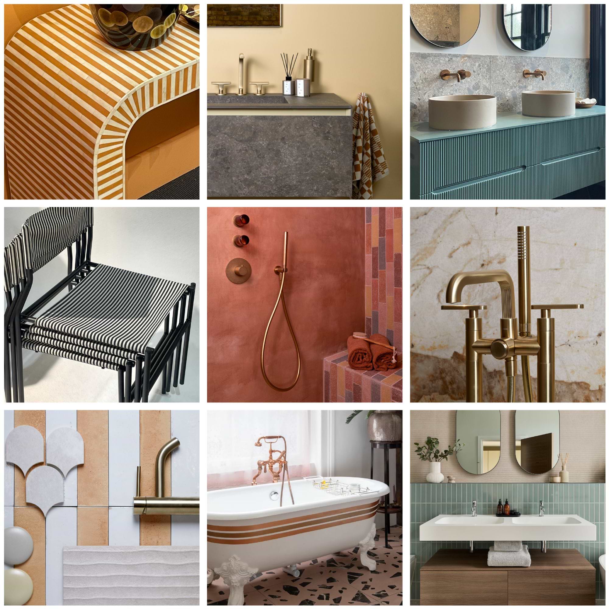As maximalism gains momentum, stripes are being reimagined through vivid colour, dynamic scale, and unexpected placement. The rise of ‘stripe drenching’ signals a move towards immersive, all-over pattern, whilst the motif’s graphic nature sees it extending across furniture, ceramics, lighting, and soft furnishings. In the bathroom, look to introduce stripes through tiling, cabinet fronts – including fluted wood, a more subtle take on stripes – and bathroom furnishings, such as lights, towels, blinds, wallpaper, and cushions.