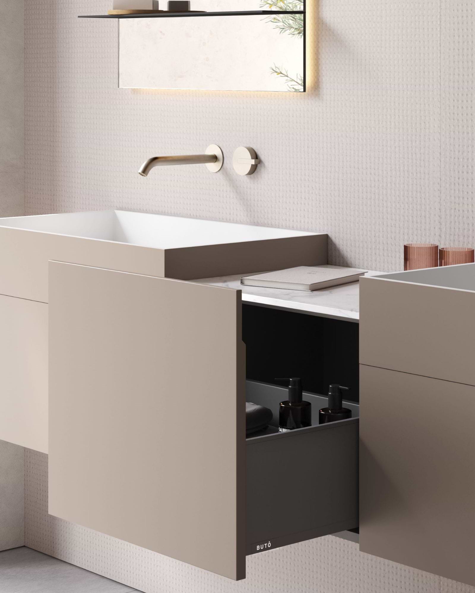 “Buto’s Camira collection is best saved for contemporary bathrooms, boasting neat basins with sharp rims and smooth, soft-close drawers and doors with cleverly designed storage compartments. Its extensive palette allows you to introduce texture, including wood, metal, and glass.”