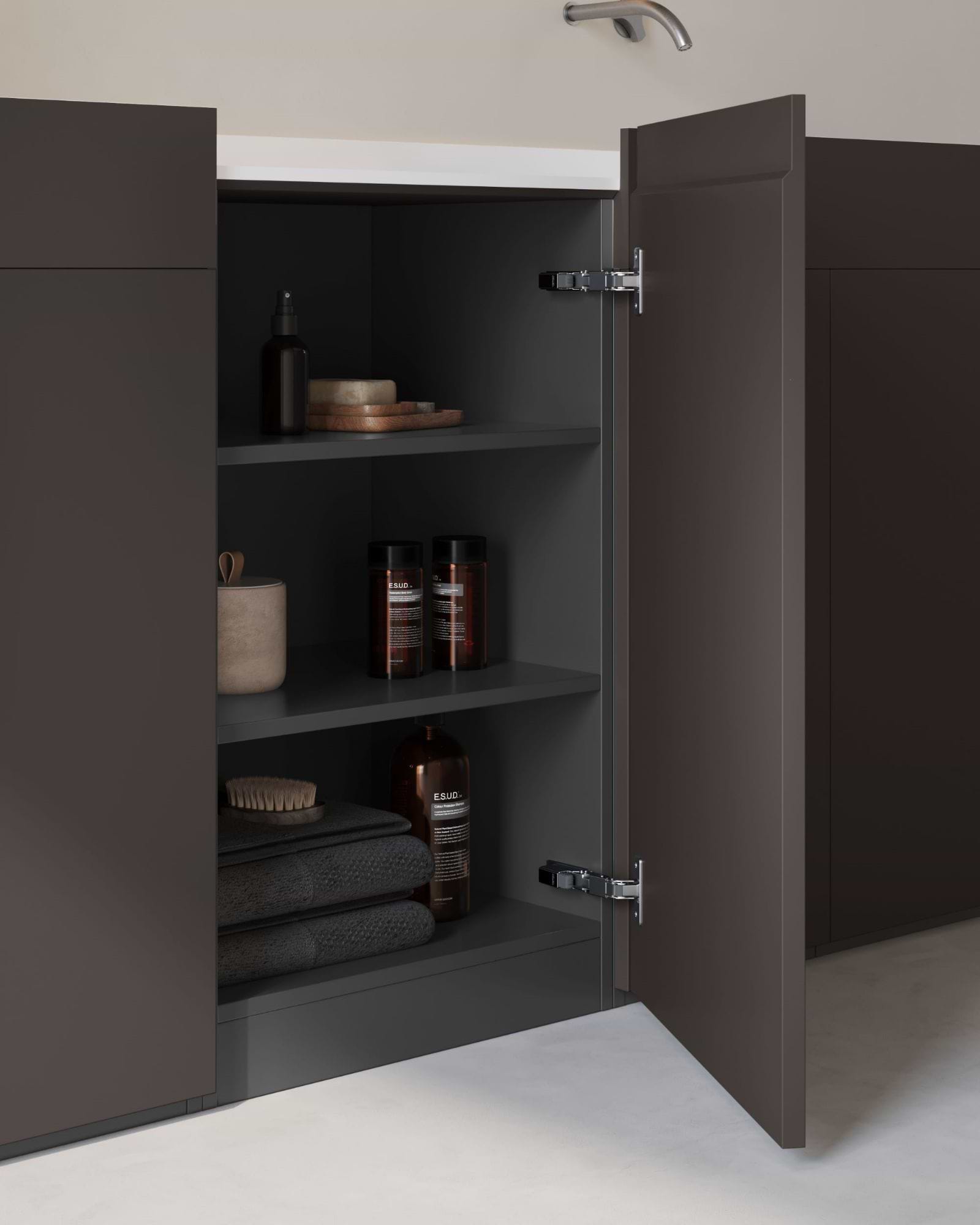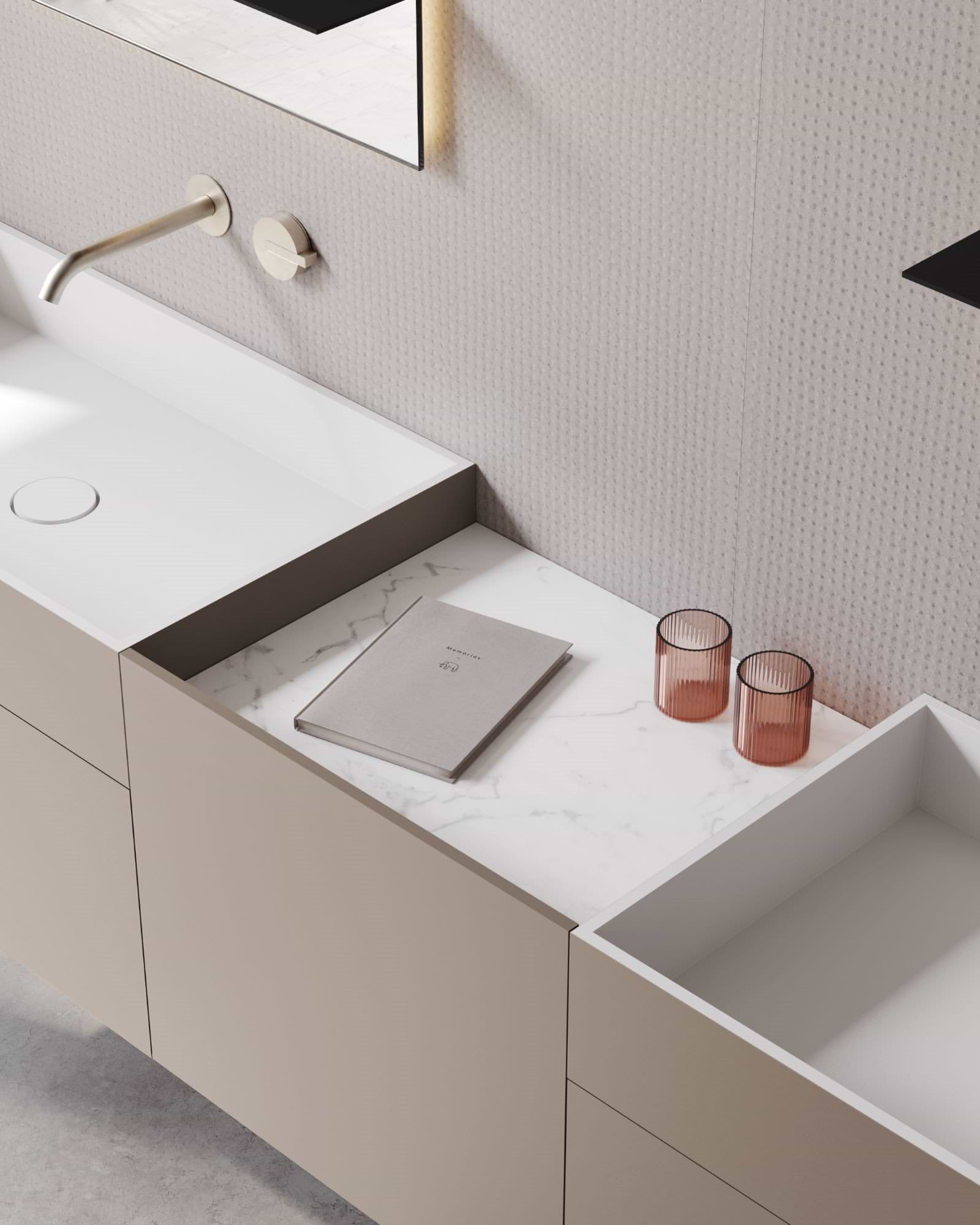The luxury bathroom furniture is available in a choice of 35 finishes, including lacquers, woods, marbles, metals, and matt glass. It is also possible to lacquer the basin fronts in the same colour as the module fronts for a harmonious result.