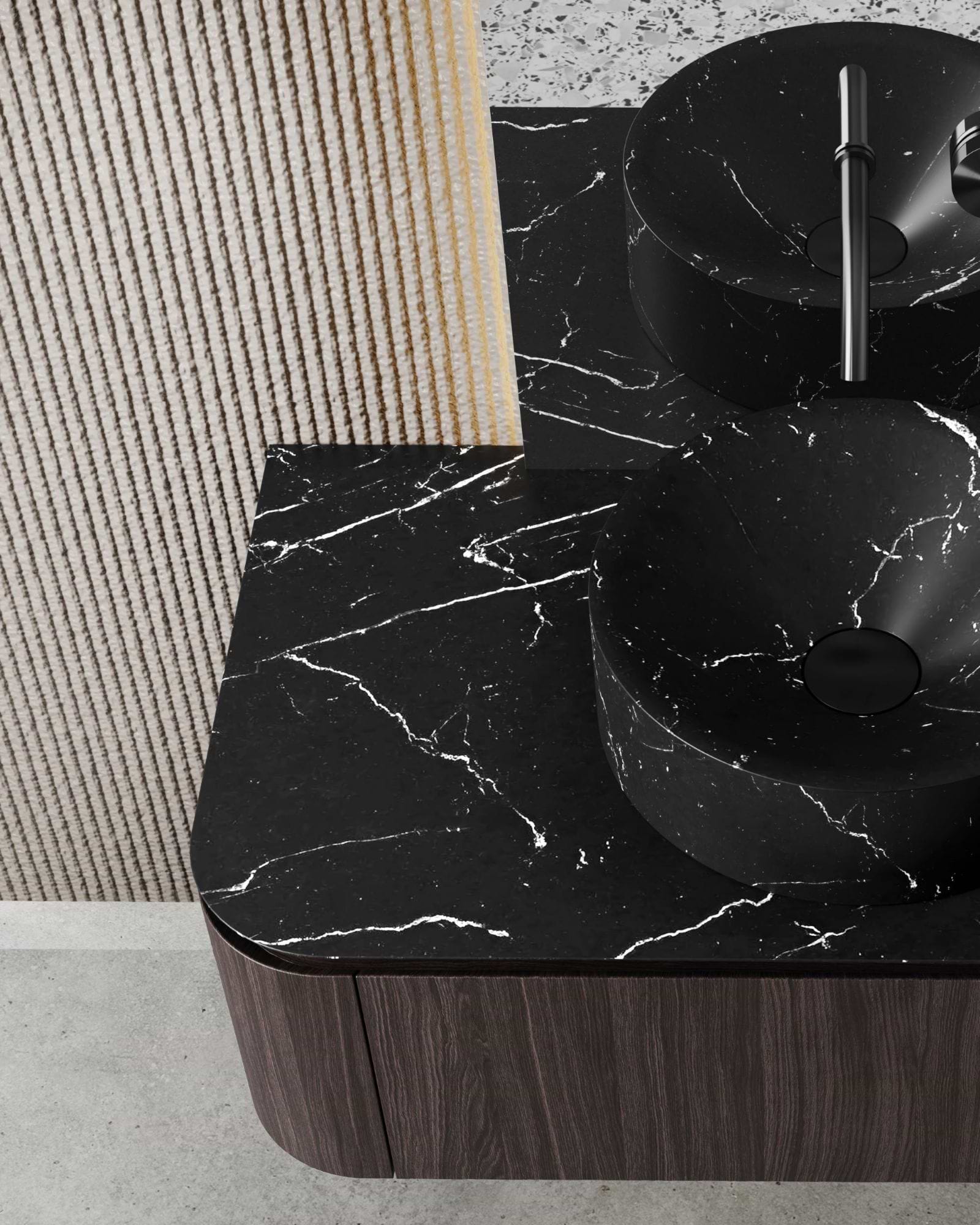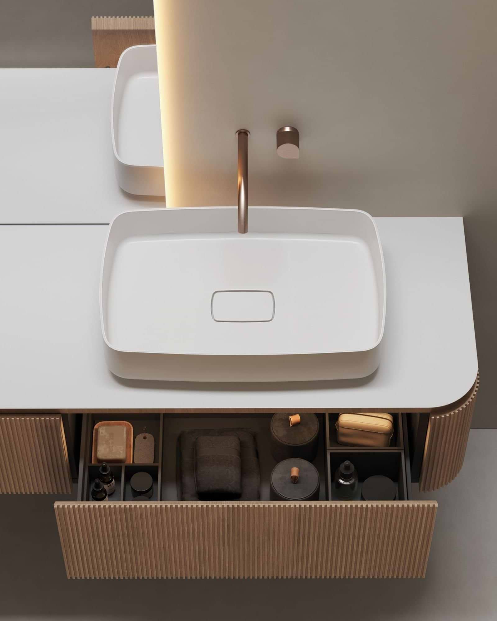 Galiano delivers an air of sophistication to any bathroom setting, wall-mounted as if floating and with handle-less drawers for a minimalist appeal. With impressive depth, Galiano features two clever end drawers designed to utilise every space for efficient storage. The unit’s drawers can be configured to suit the user’s requirements, each complete with compartments for heightened organisation.