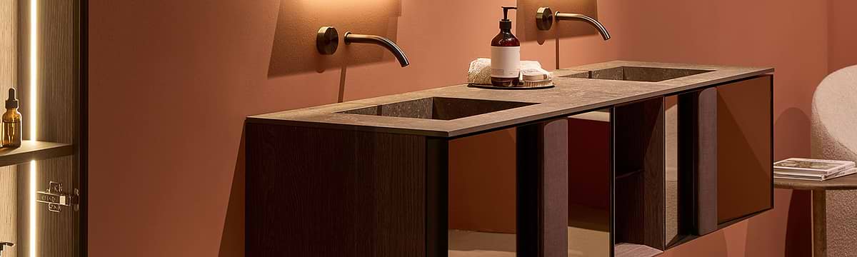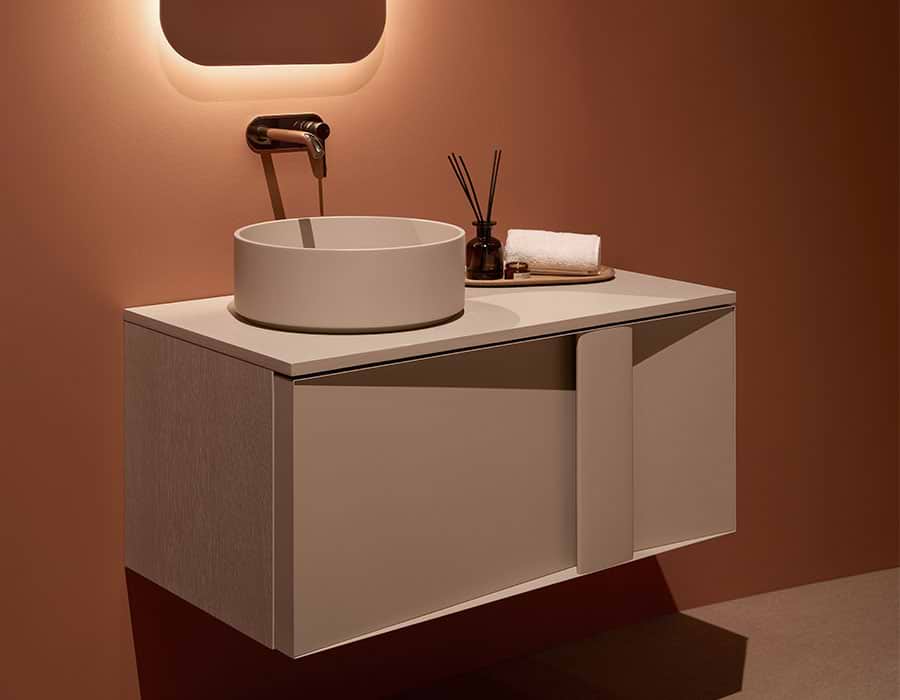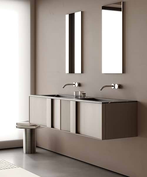 Designed by La Mamba Studio for Buto, Ribon is a collection of wall-mounted vanity units created with contemporary bathroom interiors in mind. The Ribon vanity’s imaginative aesthetic is built around intersecting planes, where tapered drawer fronts cast dynamic shadows across the surface, further enhanced by ambient lighting that every bathroom, and its user, deserves. Drawer fronts are made of wood or glass, with handles crafted from wood or porcelain for textural definition.
