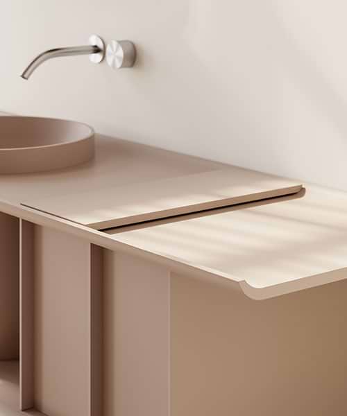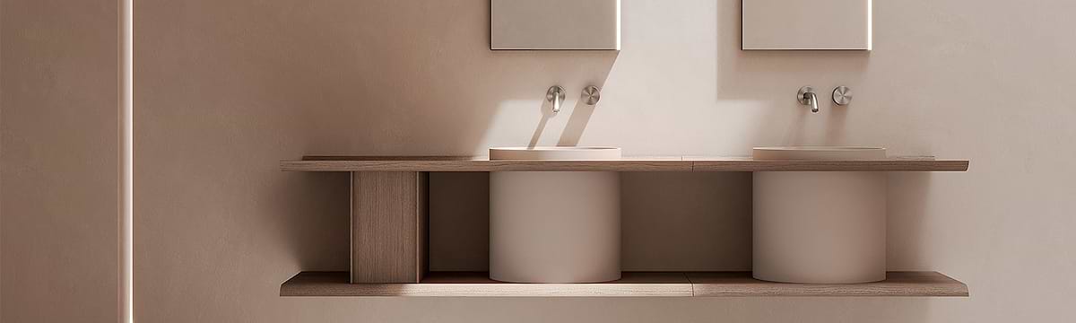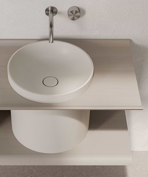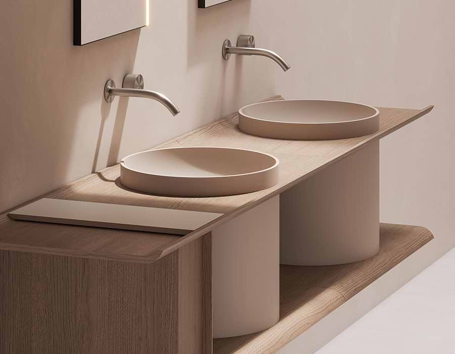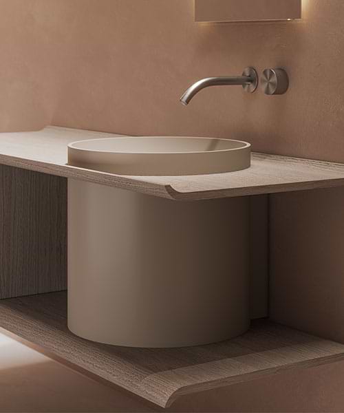 Tabuis a collection of striking basin vanity units, imagined by Summum Studio for Buto. Cylindrical matt earth-coloured solid surface basins are held in a meticulously crafted countertop, available in matt and textured lacquers, wood, and lacquered wood finishes – designed to bring warmth and balance to contemporary bathrooms.