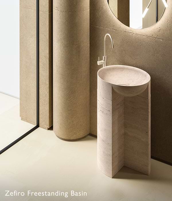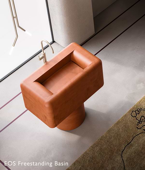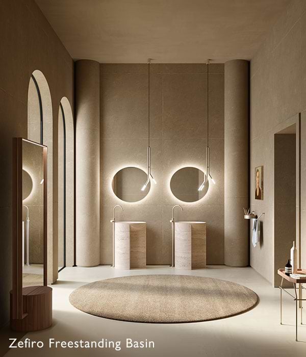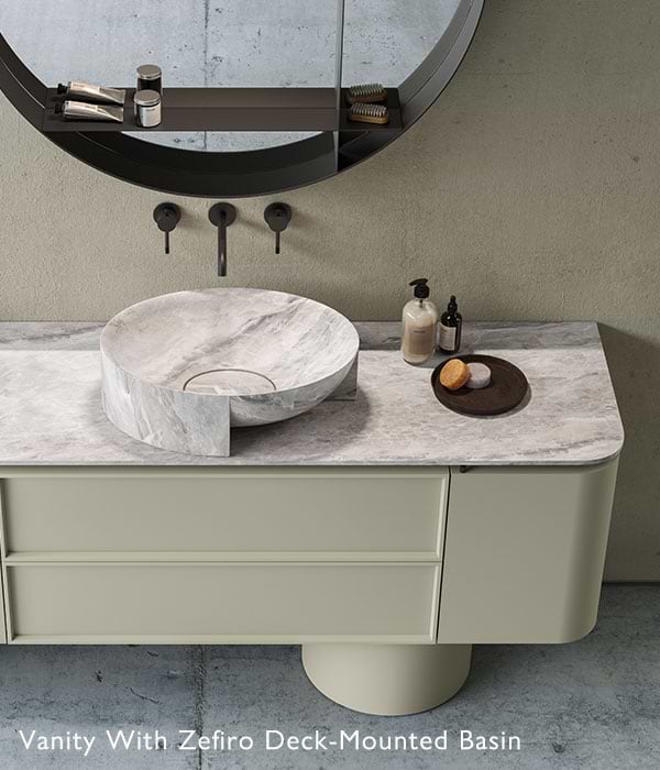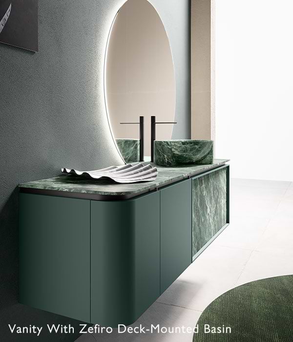Developed by Italian designer Stefano Spessotto, Des Evolution caters to individual taste, style, and bathroom setting. The vanities are available with an integrated basin, a deck-mounted Zefiro basin, or a deck-mounted EOS basin. Both the Zefiro and EOS basins are also available as freestanding options. The range also offers separate storage units and mirrors, chosen to suit the composition of the vanity unit and basin.