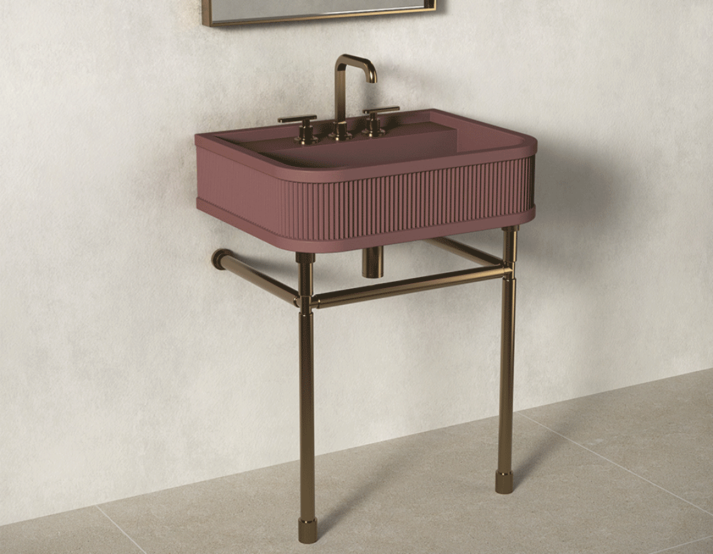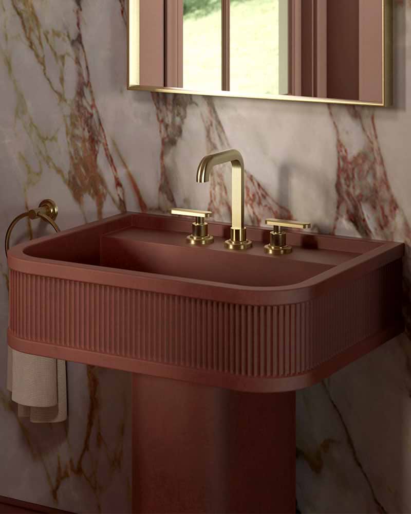 The new and exclusive Monroe basin, created in partnership with Kast, draws inspiration from the iconic freestanding silhouette of C.P. Hart's London basin whilst showcasing Kast’s specialism in the design and manufacture of contemporary concrete forms. Produced on the edge of Sherwood Forest, UK, Monroe features a framed fluted exterior and an inset basin mixer shelf, created in three design variations: wall-mounted with a pedestal, wall-mounted with a metal console stand, or wall-mounted alone.
