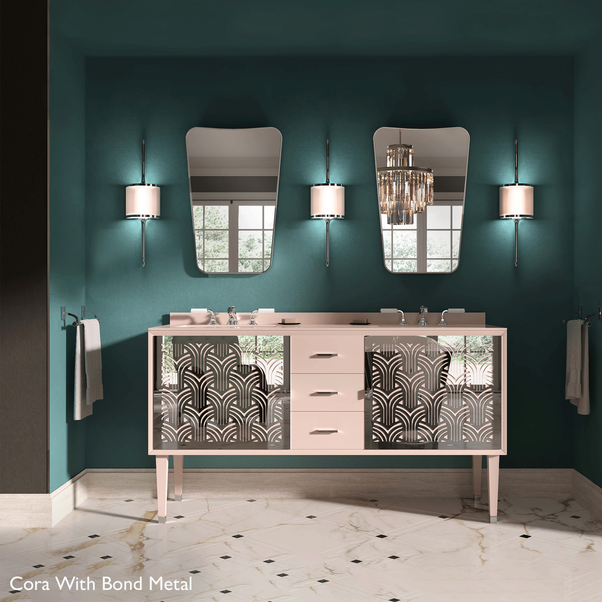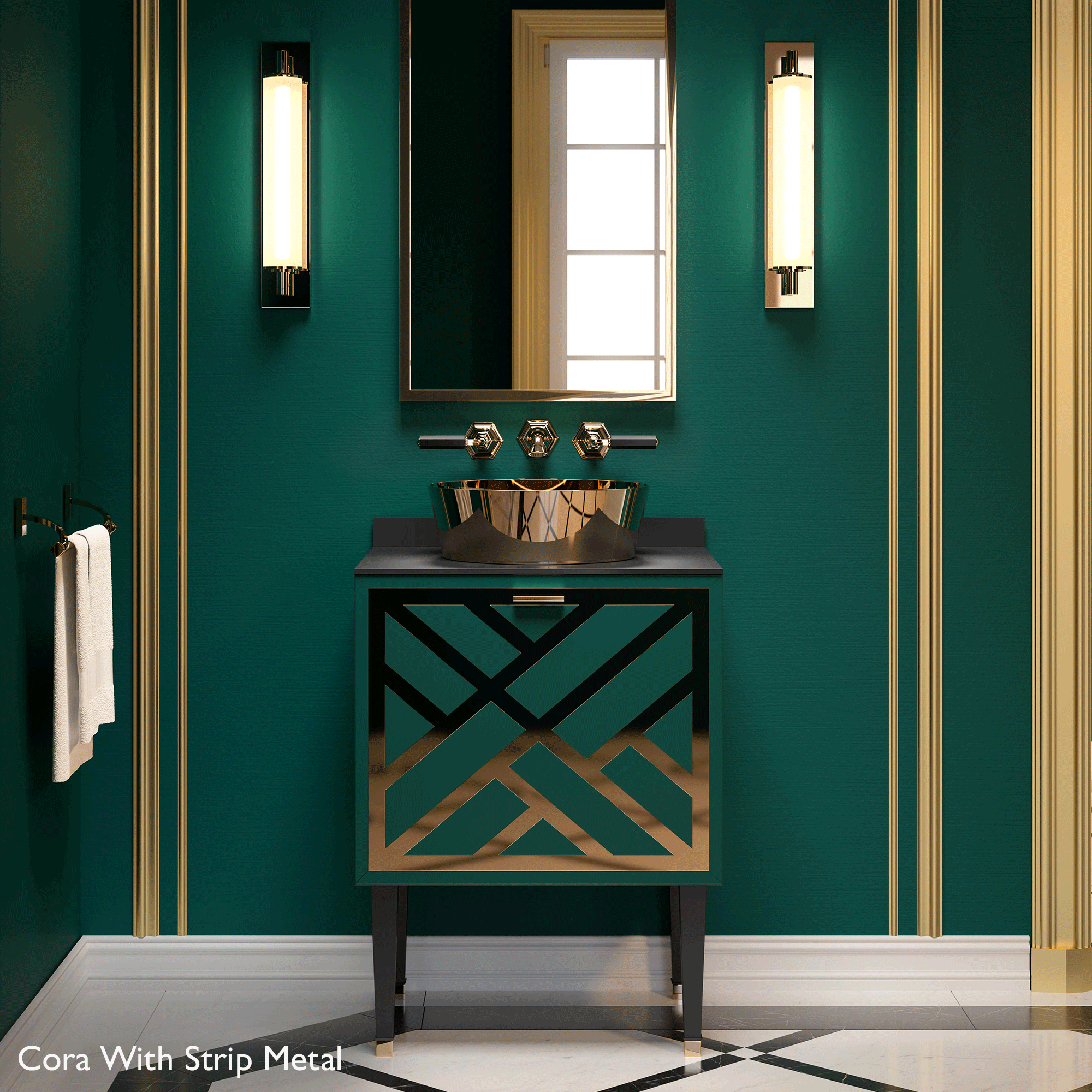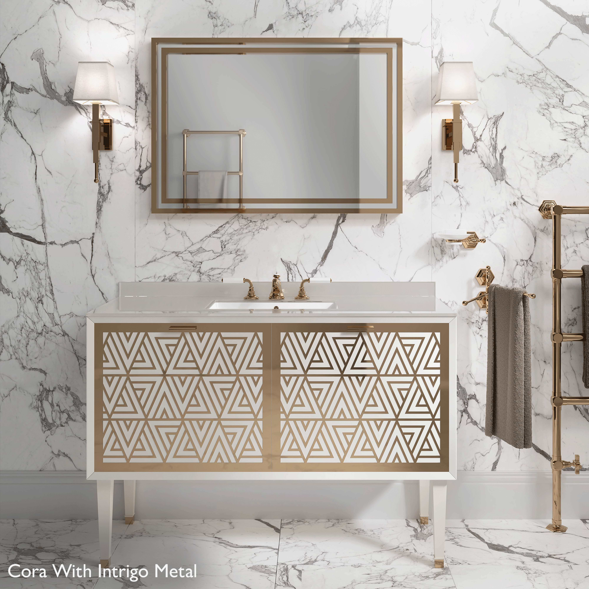 Cora is an elegant unit with metal decoration in the geometric patterns of Diamond, Intrigo, Strips, and Bond. The metal detailing offers a choice of 10 finishes on a unit available in three sizes and all RAL/NCS colours. The countertop comes in glass or marble, with a range of basins.