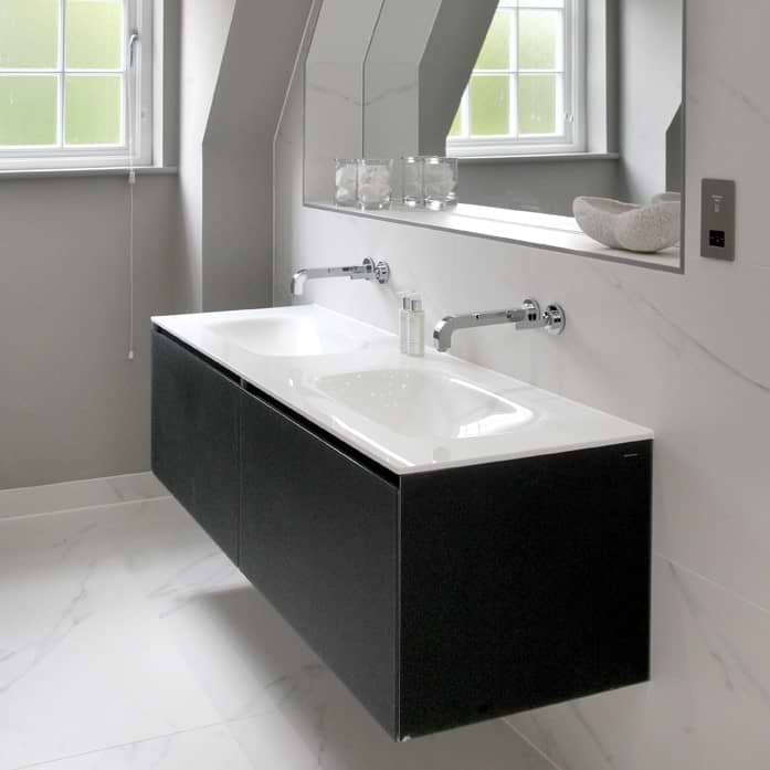 Carolyn Harrison, Head of Contracts, comments, ‘The attention to detail shown throughout the property is testament to Searchfield Homes’ creative design vision, and is particularly evident in the bathrooms where we have teamed sculpted brassware and basins, with high quality WCs and furniture pieces. We are delighted with the final bathroom schemes and quality of finish.’