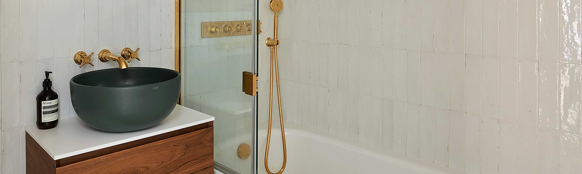 Brushed Gold brassware features throughout the bathroom, specified from our exclusive Epoch collection. In the shower, a three-way diverter controls the overhead shower, hand shower, and bath filler. A wall-mounted mixer was chosen for the basin, installed above the Cielo Shui Washbowl in ‘Muschio’ to free space on the Cubik vanity.