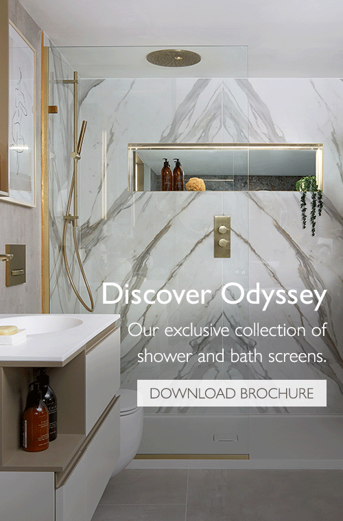 Expertly manufactured in the UK, Odyssey presents a series of wetroom panels, sliding doors, hinged doors, and bath screens, each constructed from 10mm toughened safety glass and available in Matt Black, Brushed Brass, Brushed Nickel, and Chrome.