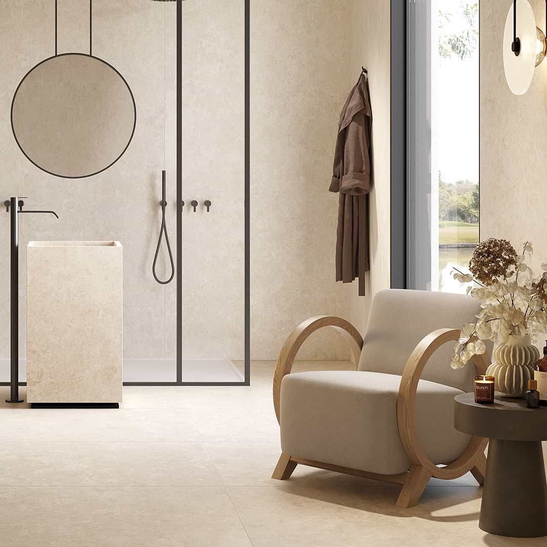 From afar, Elysian’s flecked surfaces and muted tones appear minimalist, while up close, the natural nuances and delicate detailing of the minerals found in natural stone prove its authentic appeal. Created from rectified porcelain in Italy, Elysian is available in a number of sizes, including large-format tiles for wall-to-ceiling installation.