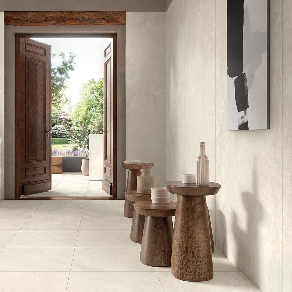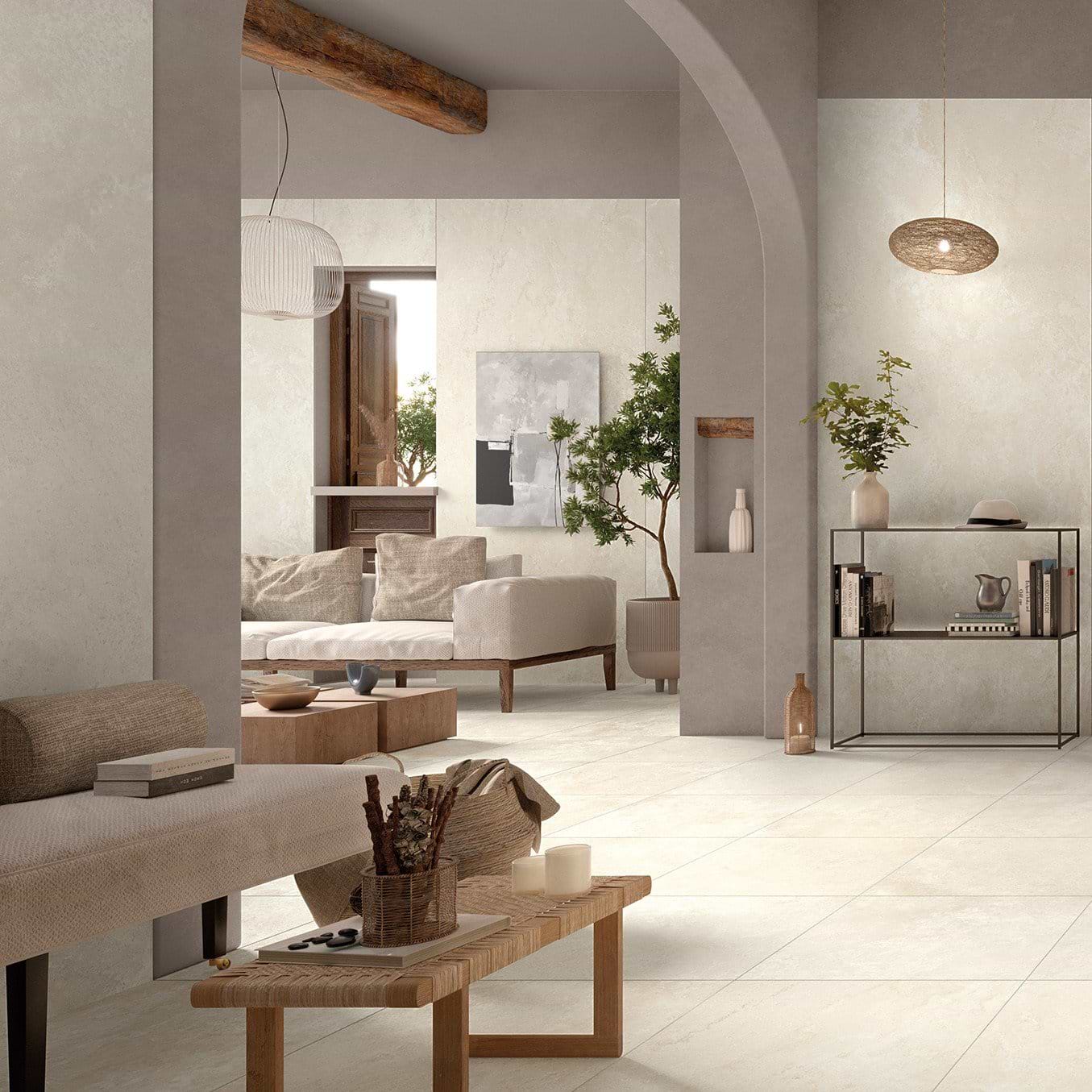 Elysian is available in two intricately designed finishes: Mediterranea, a soft, cloud-like composition, and Desert Stone, a warm beige-grey tone.