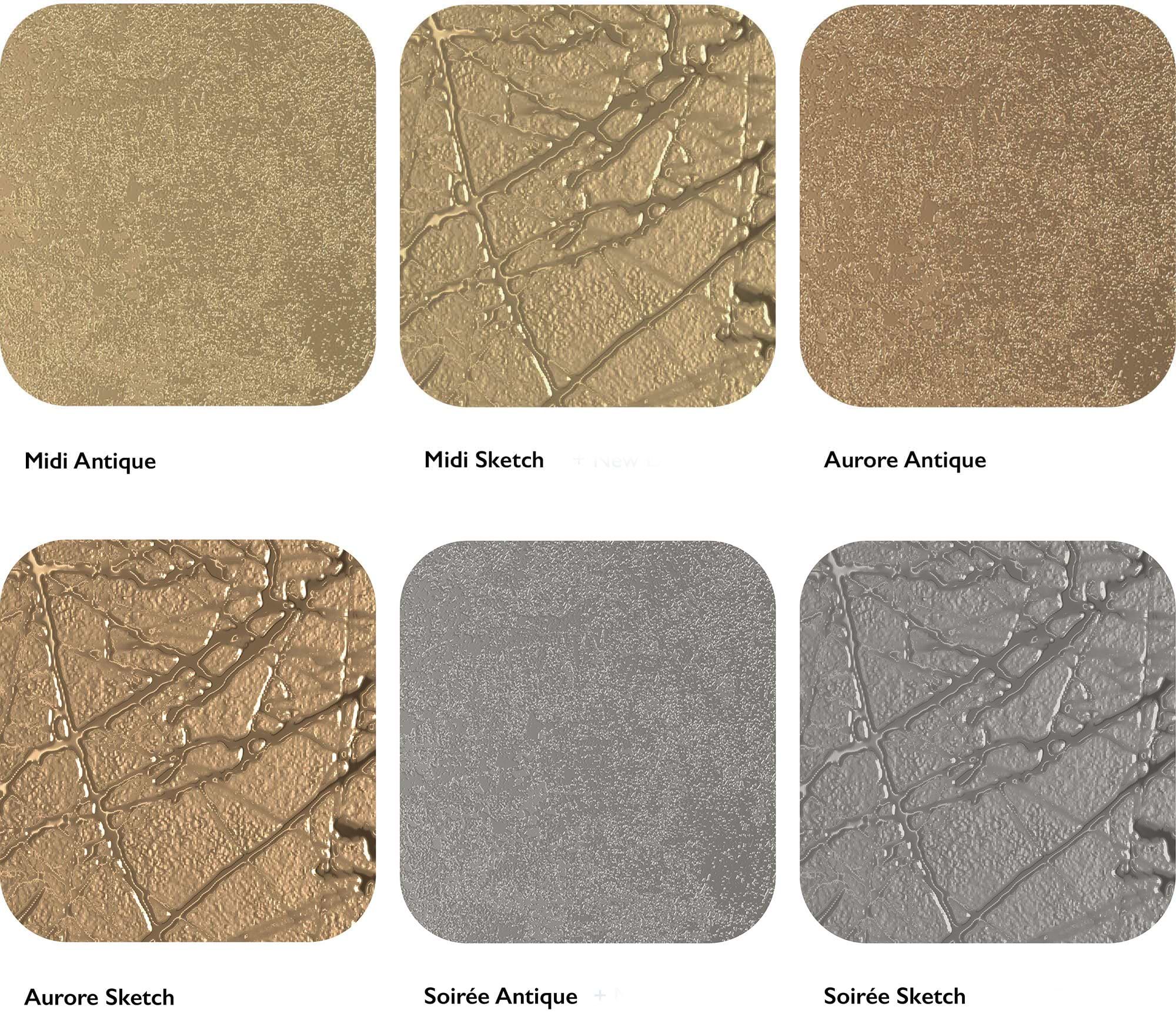 The Reflet tile series presents three lustrous colourways of Aurore (bronze), Soirée (silver), and Midi (gold). Each colourway exhibits two surface variations: ‘Antique’, a polished, mirror-like finish with the effect of a naturally ageing patina, and ‘Sketch’, which illustrates a textured, etched surface.